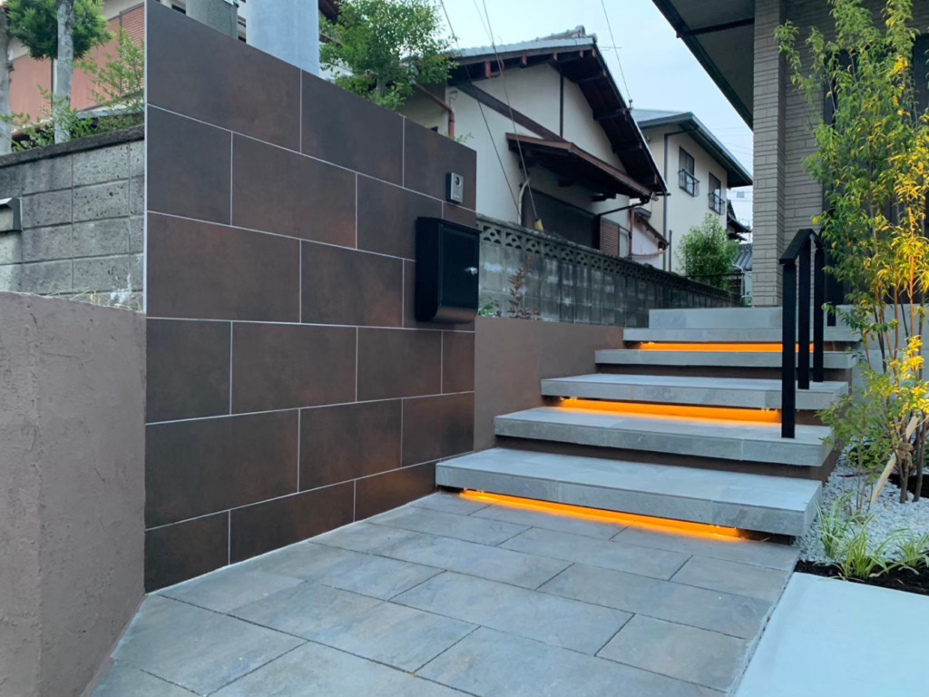 素材と納まり次第です。階段は見た目よりも先に、滑りにくさ・段差の見え方・踏面寸法を押さえます。特に雨の日は差が出るので、タイルの表面特性と照明計画をセットで考えるのが安全です。