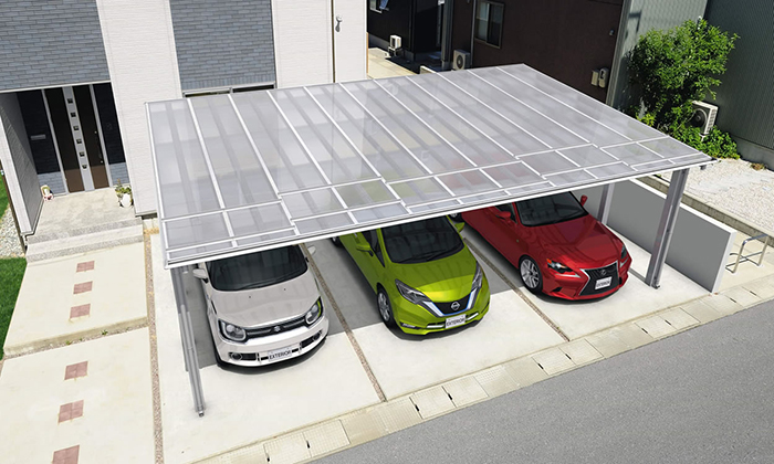 屋根材にポリカーボネート板(ポリカ板)を使ったカーポートのことです。光を通しやすく、屋根下が暗くなりにくい一方で、紫外線対策仕様が多く、駐車中の車を日差し・雨・雹などから守りやすいのが特長です。