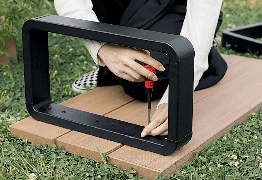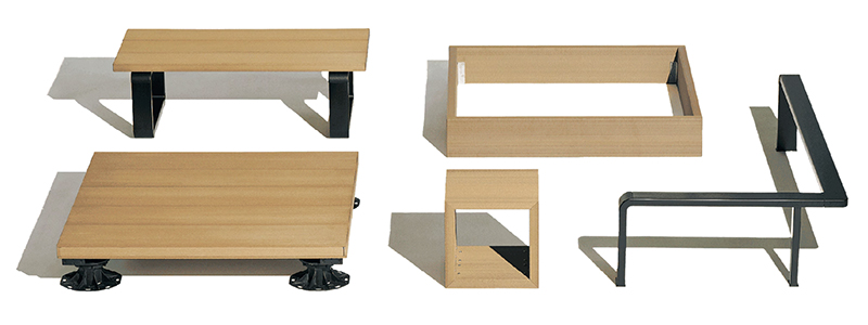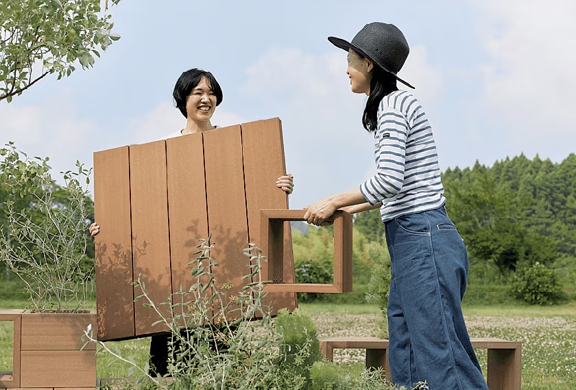 人工木パーツは軽量で扱いやすく、DIYでも設置しやすいのが魅力。ベンチやボックスモジュールを組み合わせれば、座れる場所や高低差をつけたレイアウトも自在に楽しめます。
