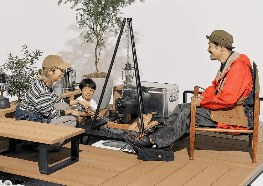 ダッチオーブンを吊るせばアウトドアキッチンが完成し、日常の食事も特別な時間に変わります。ベンチやボックスはロースタイルで、キャンプチェアとの相性も抜群。普段使っているアウトドアギアと自然に馴染むので、自宅にいながら非日常を味わえます。